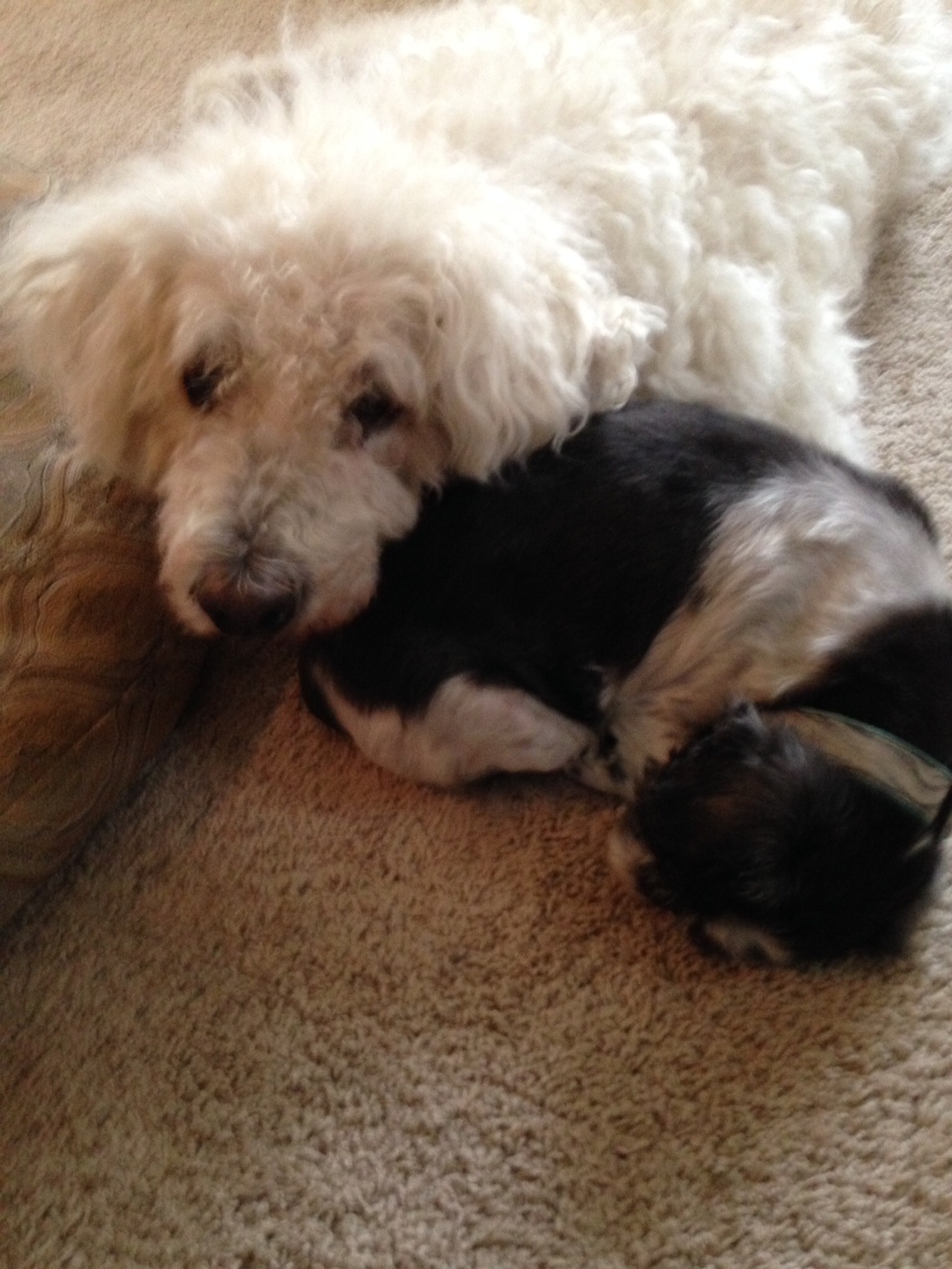 Robbie (13) came through rescue several years ago and in his new home bonded with a rescue shih tzu, Aria. They sleep together and constantly keep tabs on each other.